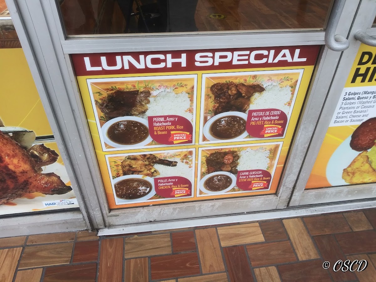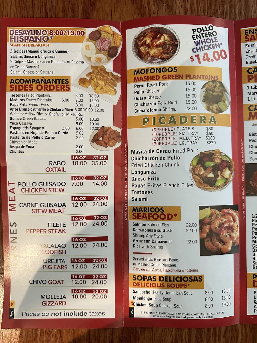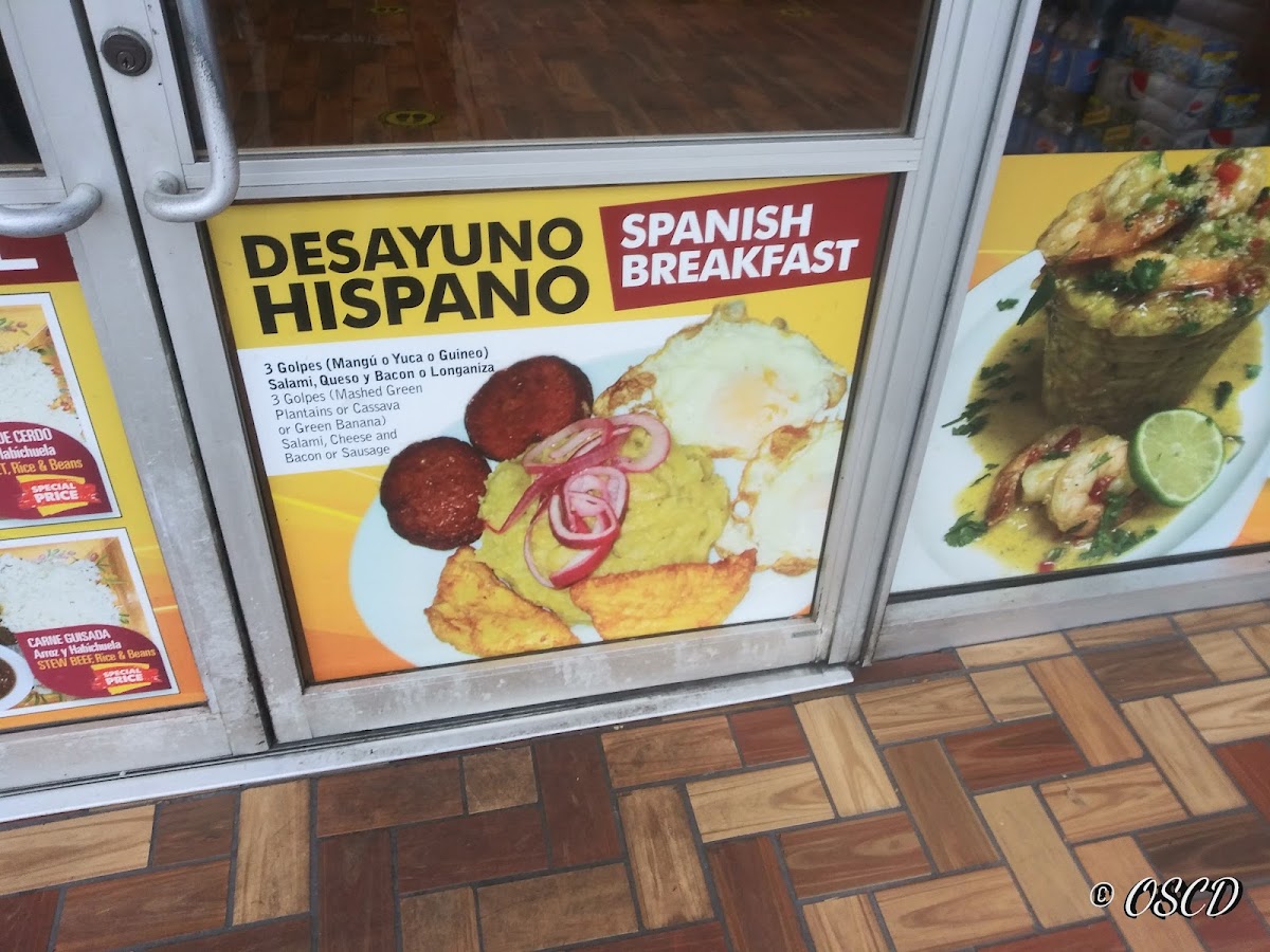 3 golpes (mangú o yuca o guineo), salami, queso o longaniza. / 3 golpes (mashed green plantains or cassava or green banana), salami, cheese or sausage.