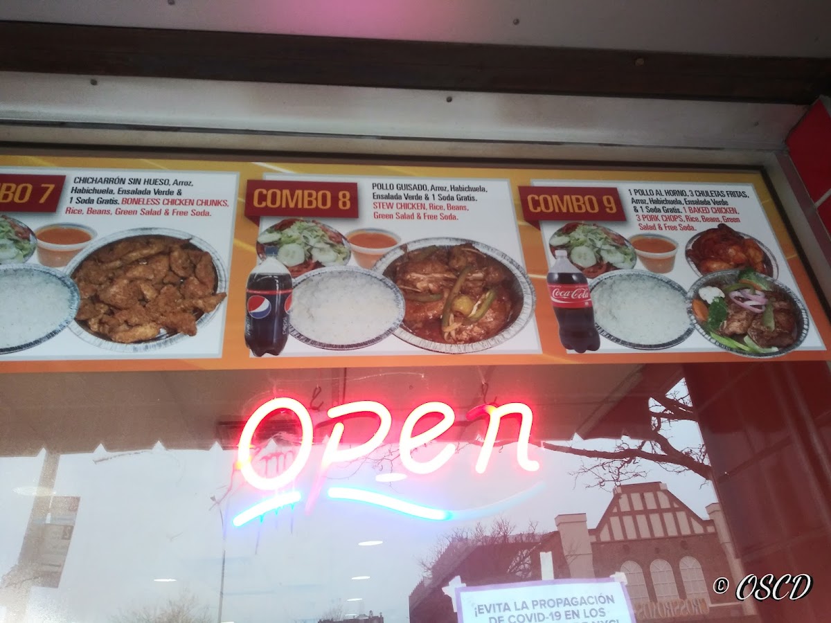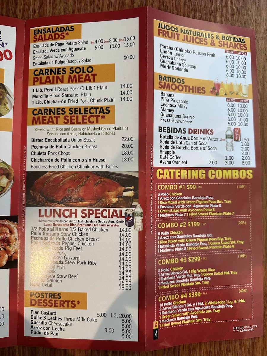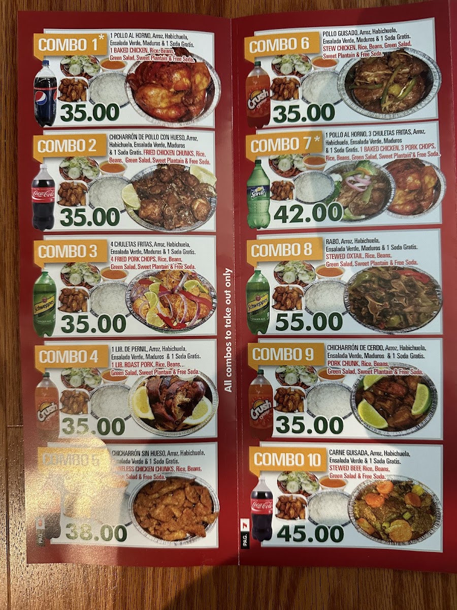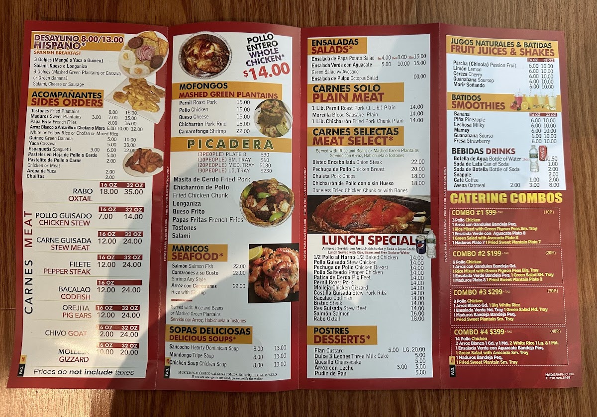 3 golpes (mangú o yuca o guineo), salami, queso o longaniza. / 3 golpes (mashed green plantains or cassava or green banana), salami, cheese or sausage.